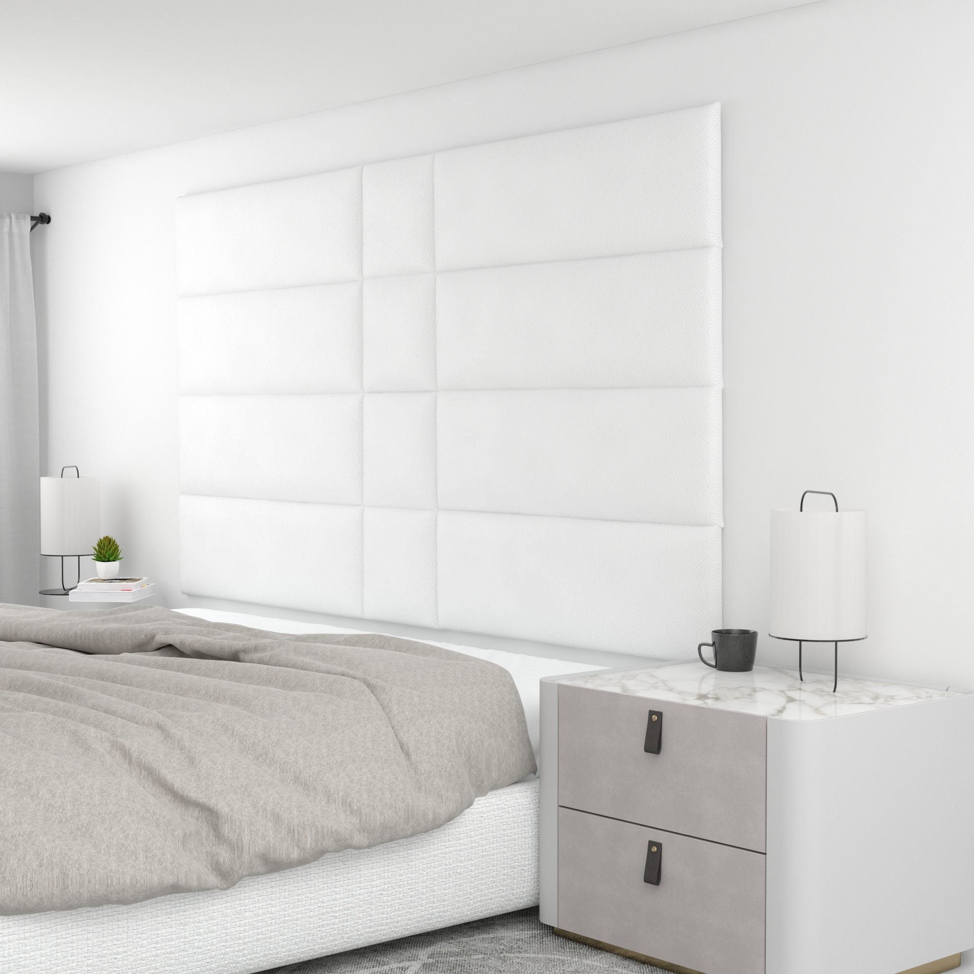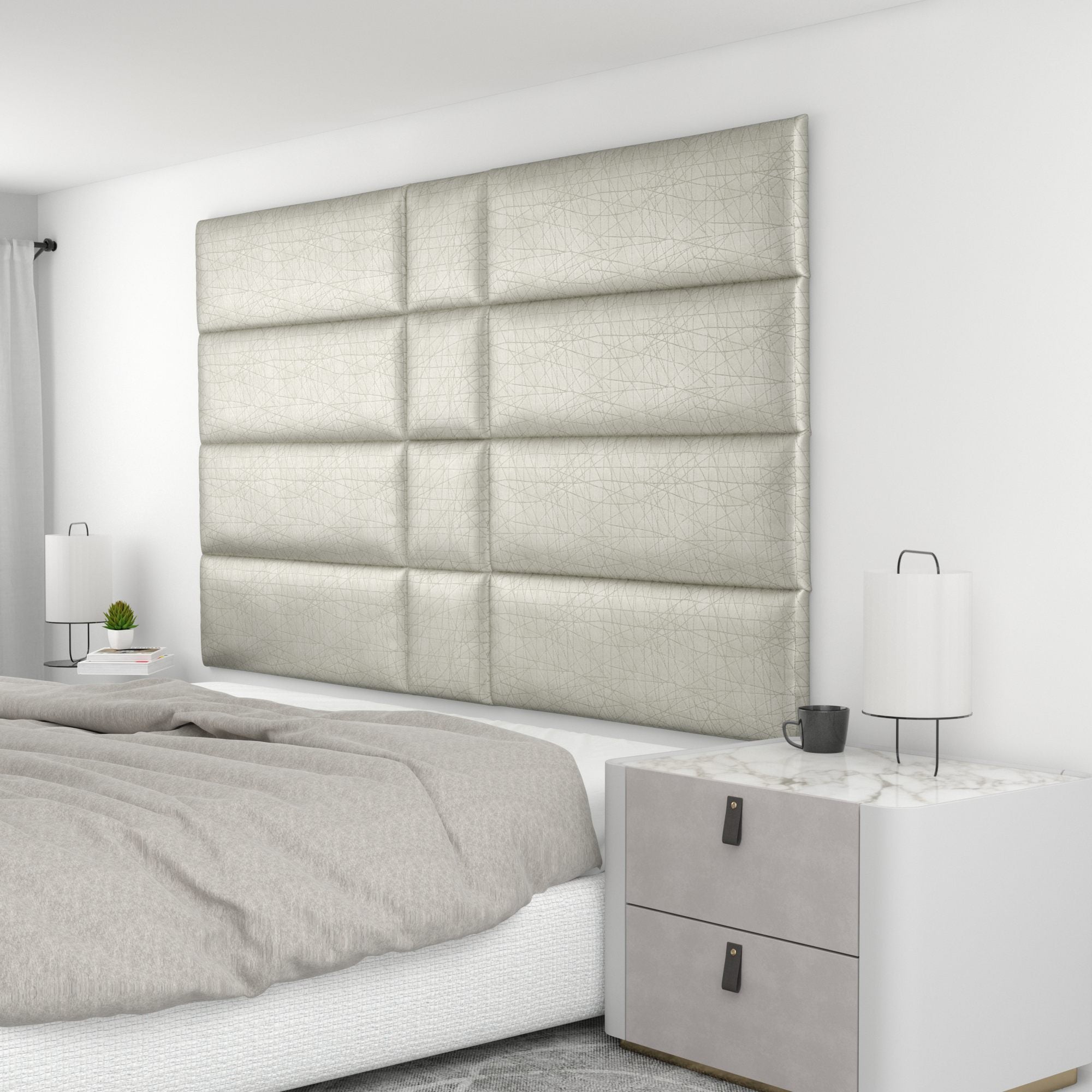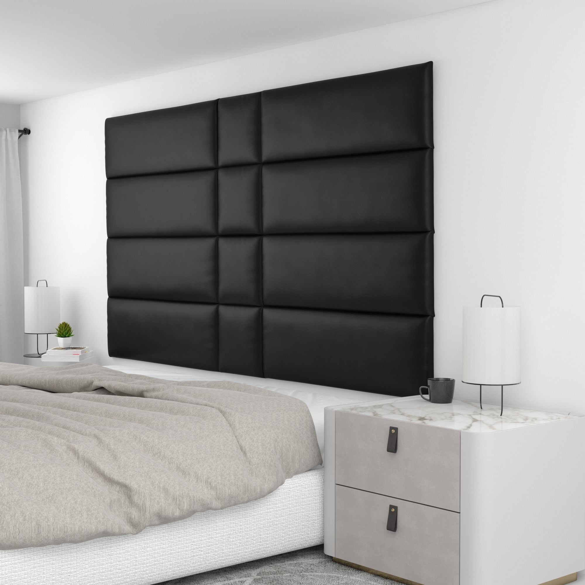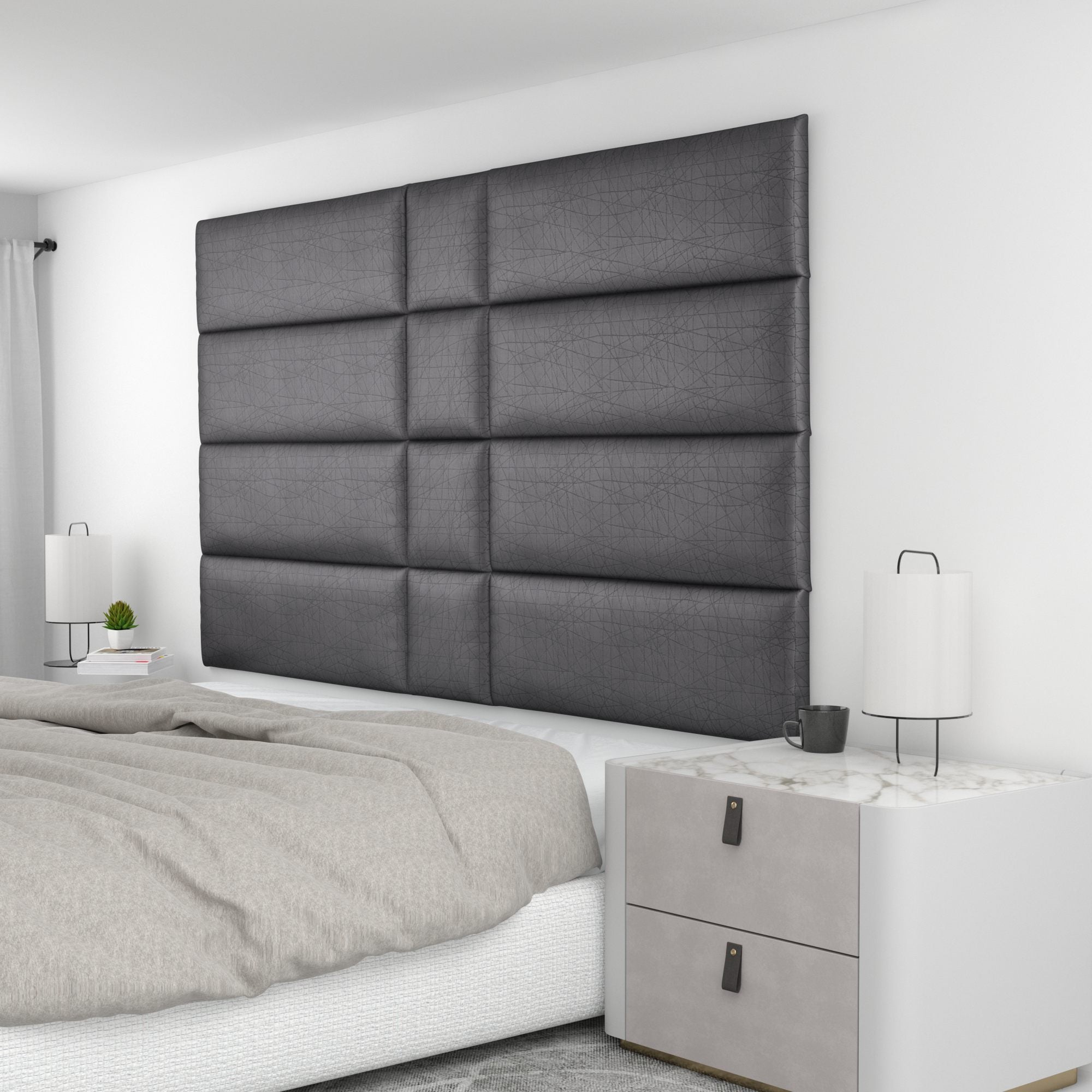 Finish your bedroom, office, or living space in elegance with Wall Panel Pros! Our wall panels mount easily in just minutes and completely transform your room without breaking the bank. Our panels are offered in three sizes (12x12", 12x24", and 12x36") in over 40 color/texture options, making the pattern possibilities endless. With such a wide variety of looks, you are sure to find or create something that compliments your decor seamlessly. Mounting the panels is easy: just measure to find the center point of your install area, mark the location of where your first set of screws will go with the included locator pins (these pop into the mounting pucks on the backs of the panels) and a level, and screw the included mounting pucks into the wall where your marks have been made for a perfectly aligned array! The first panel is used as a reference to help mark the locations of each next panel; the process couldn't be more simple. Once mounted, the panels can be easily removed for cleaning. Wall Panel Pros kits are perfect as a luxurious headboard replacement, to back a couch in a living area, or even to serve as an ultra-professional backdrop for your office desk. Upgrade the look of your home or office in no time with Wall Panel Pros!