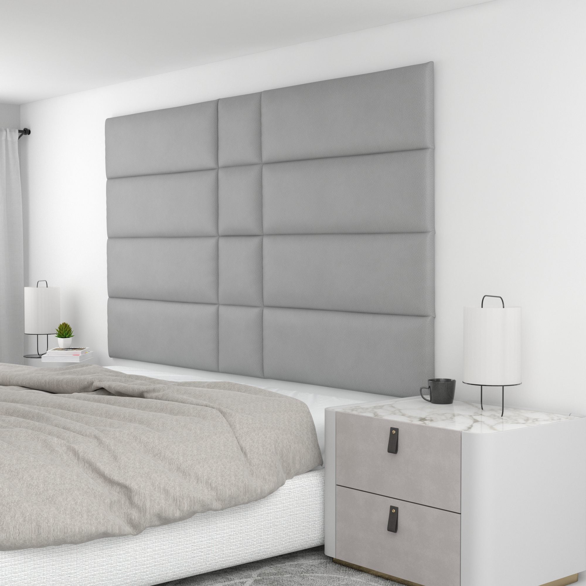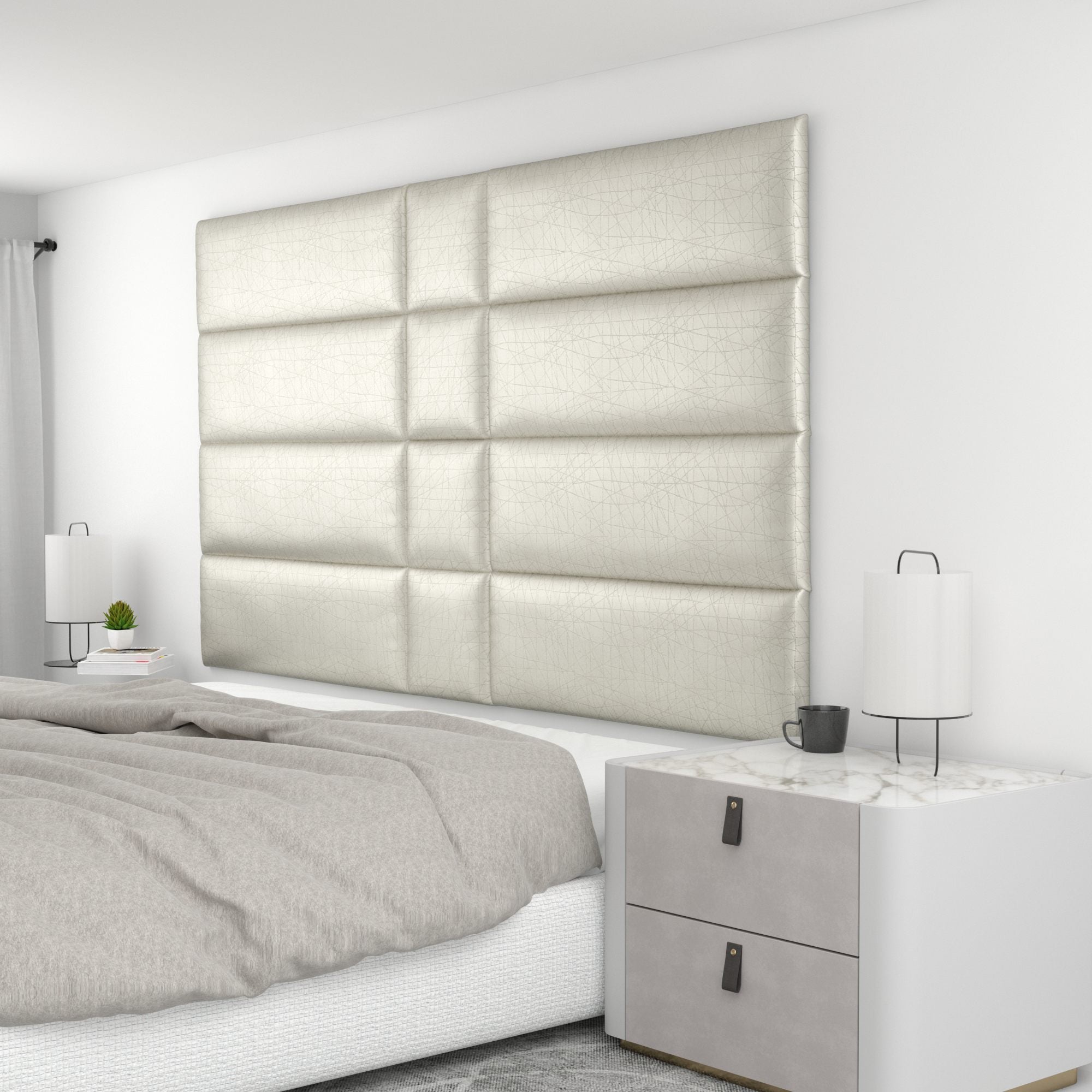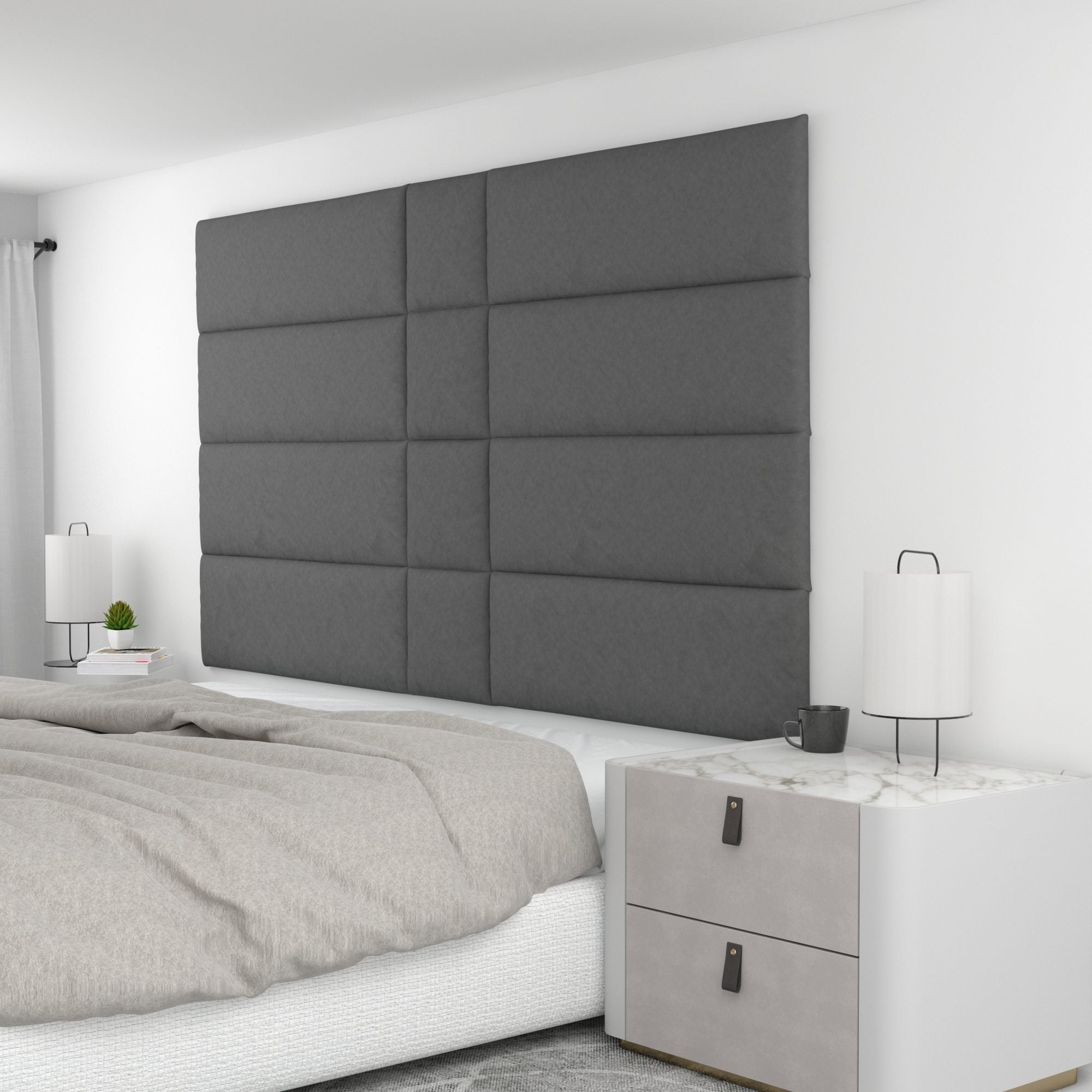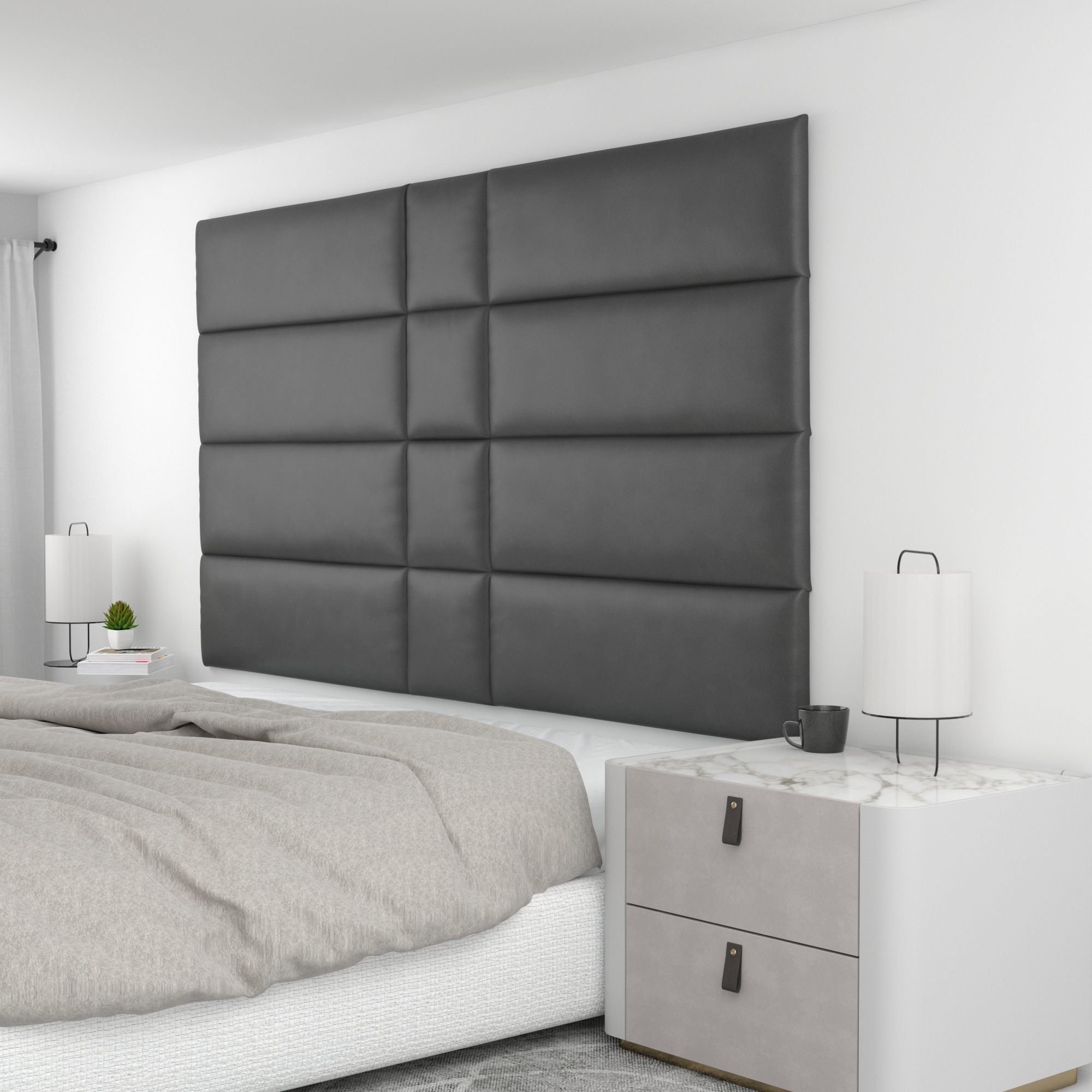Finish your bedroom, office, or living space in elegance with Wall Panel Pros! Our wall panels mount easily in just minutes and completely transform your room without breaking the bank. Our panels are offered in three sizes (12x12", 12x24", and 12x36") in over 40 color/texture options, making the pattern possibilities endless. With such a wide variety of looks, you are sure to find or create something that compliments your decor seamlessly. Mounting the panels is easy: just measure to find the center point of your install area, mark the location of where your first set of screws will go with the included locator pins (these pop into the mounting pucks on the backs of the panels) and a level, and screw the included mounting pucks into the wall where your marks have been made for a perfectly aligned array! The first panel is used as a reference to help mark the locations of each next panel; the process couldn't be more simple. Once mounted, the panels can be easily removed for cleaning. Wall Panel Pros kits are perfect as a luxurious headboard replacement, to back a couch in a living area, or even to serve as an ultra-professional backdrop for your office desk. Upgrade the look of your home or office in no time with Wall Panel Pros!