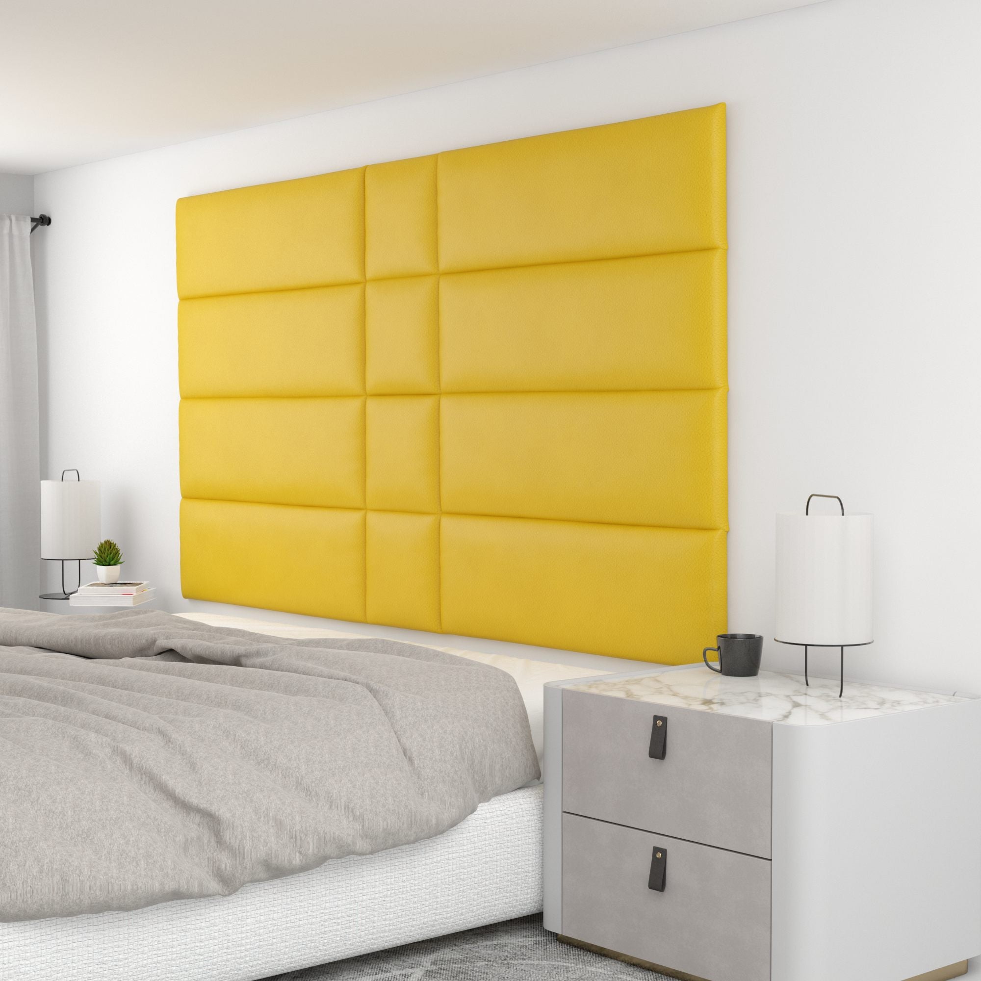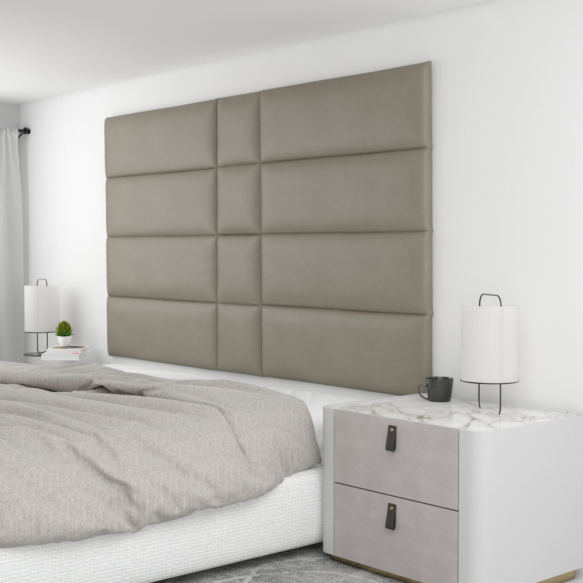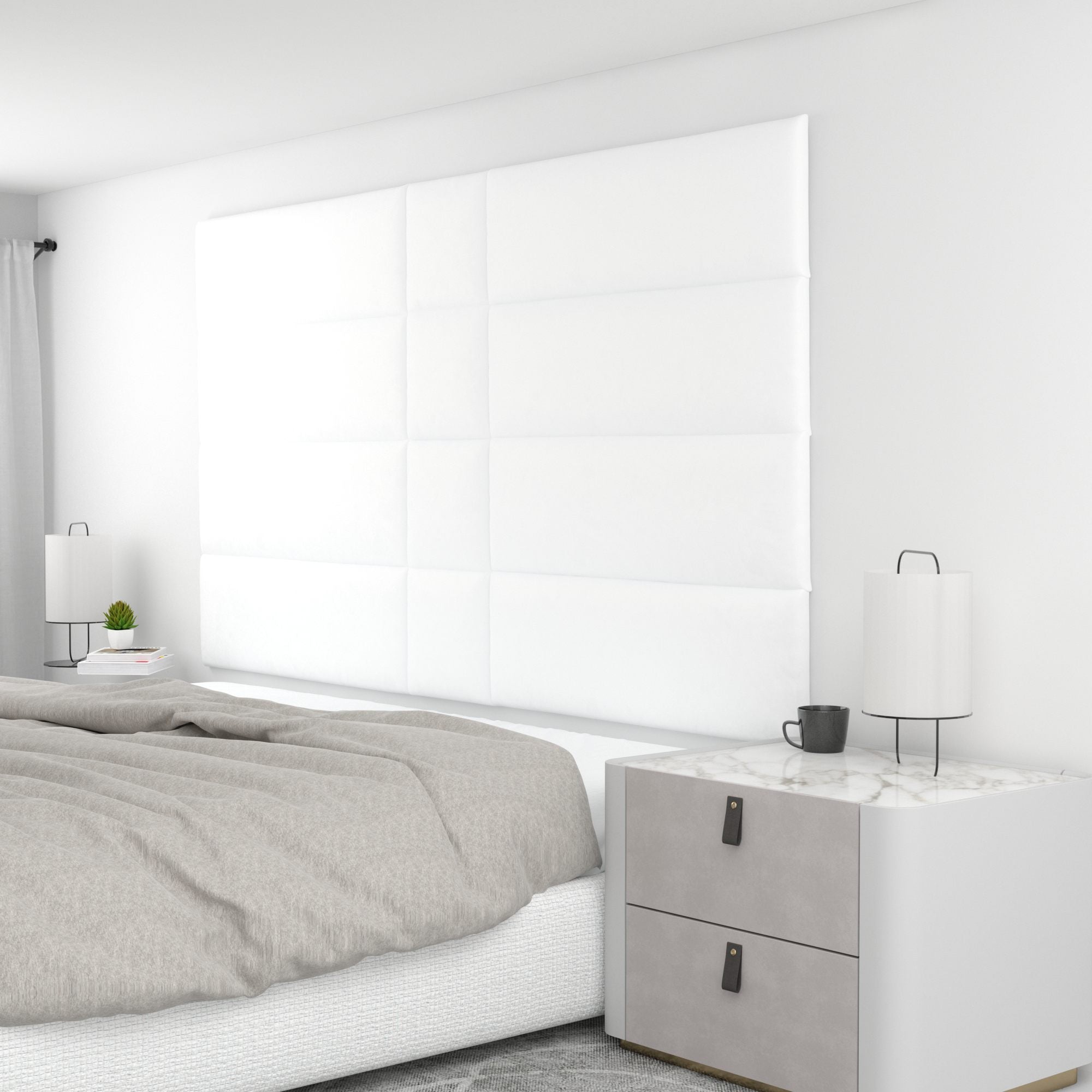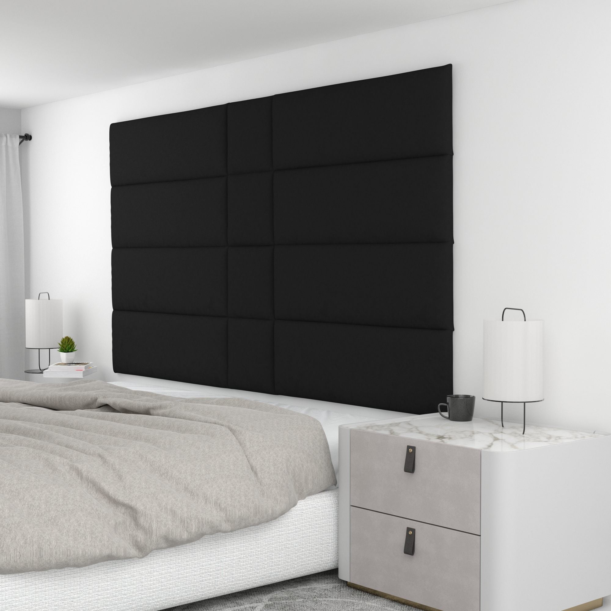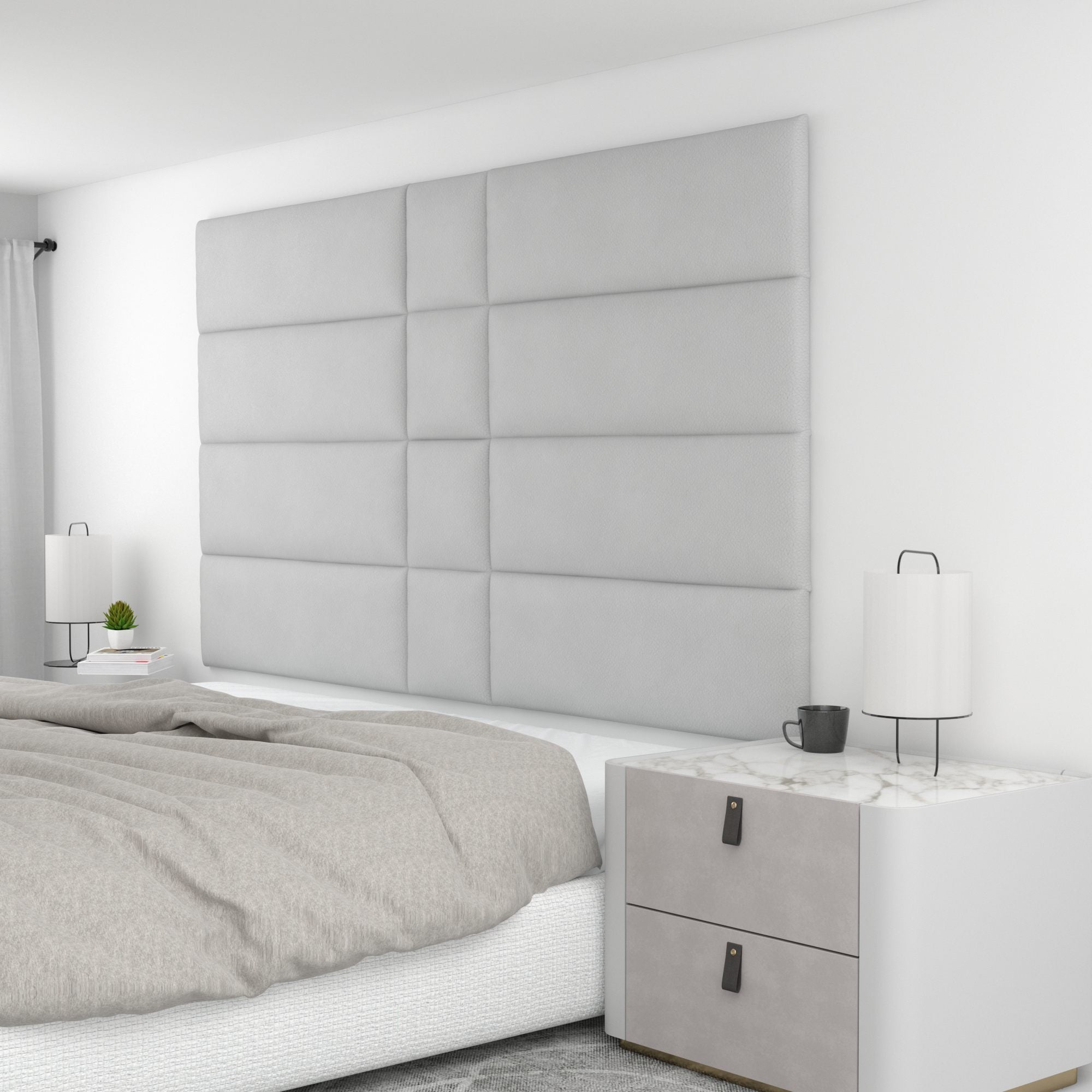 Finish your bedroom, office, or living space in elegance with Wall Panel Pros! Our wall panels mount easily in just minutes and completely transform your room without breaking the bank. Our panels are offered in three sizes (12x12", 12x24", and 12x36") in over 40 color/texture options, making the pattern possibilities endless. With such a wide variety of looks, you are sure to find or create something that compliments your decor seamlessly. Mounting the panels is easy: just measure to find the center point of your install area, mark the location of where your first set of screws will go with the included locator pins (these pop into the mounting pucks on the backs of the panels) and a level, and screw the included mounting pucks into the wall where your marks have been made for a perfectly aligned array! The first panel is used as a reference to help mark the locations of each next panel; the process couldn't be more simple. Once mounted, the panels can be easily removed for cleaning. Wall Panel Pros kits are perfect as a luxurious headboard replacement, to back a couch in a living area, or even to serve as an ultra-professional backdrop for your office desk. Upgrade the look of your home or office in no time with Wall Panel Pros!