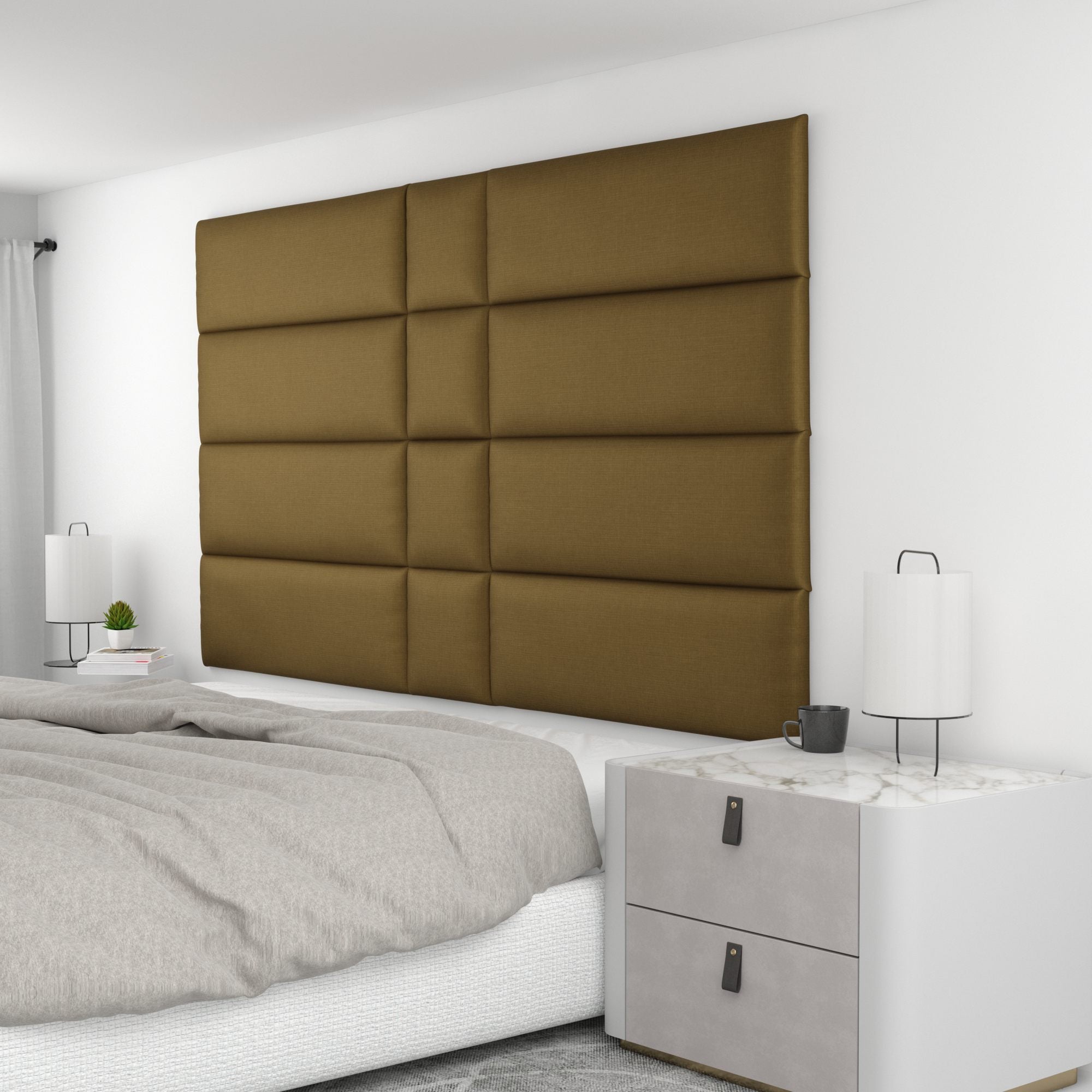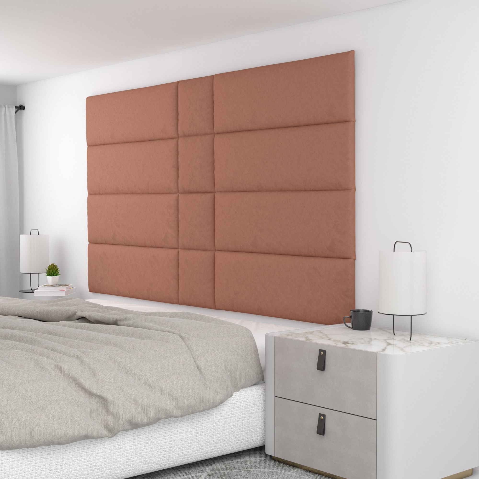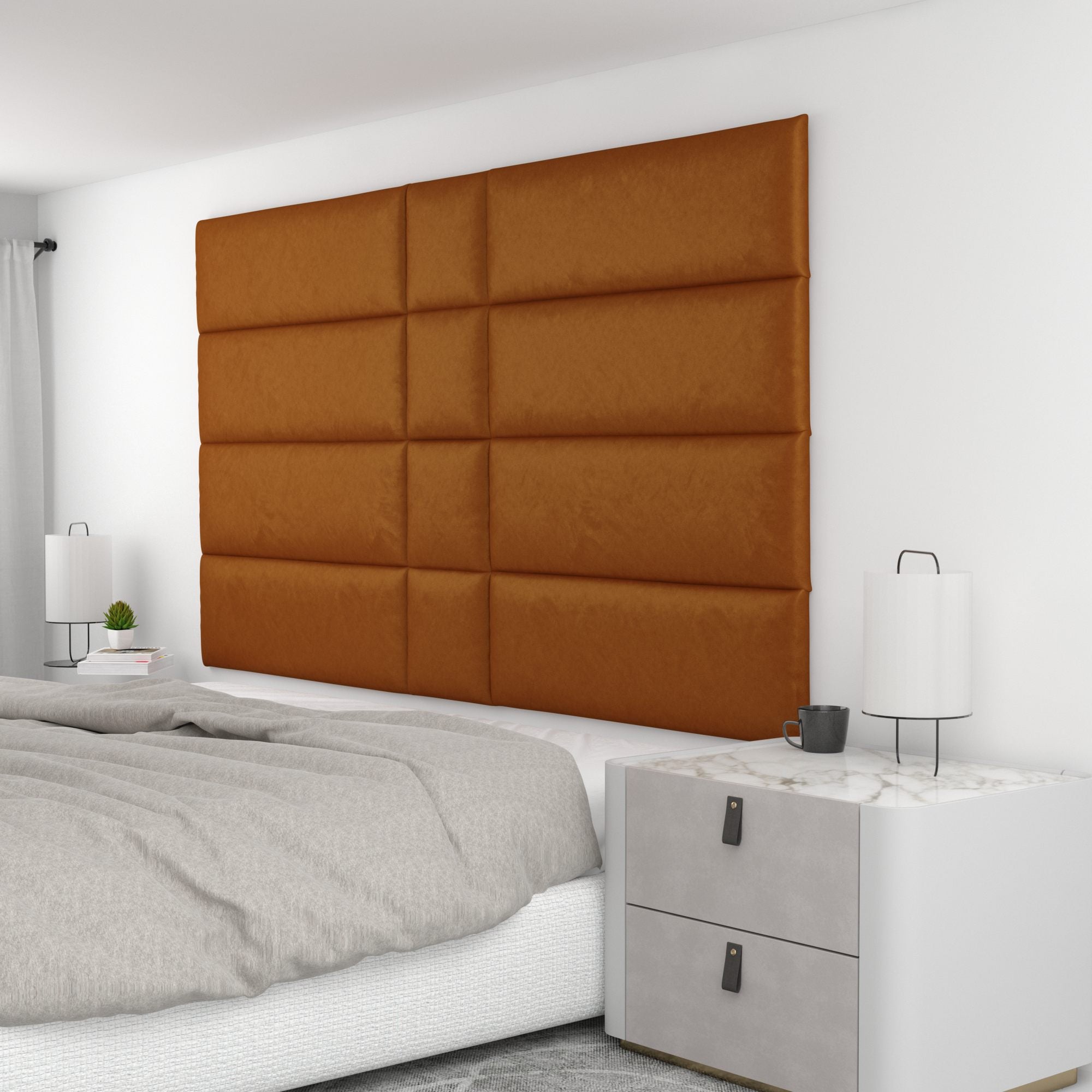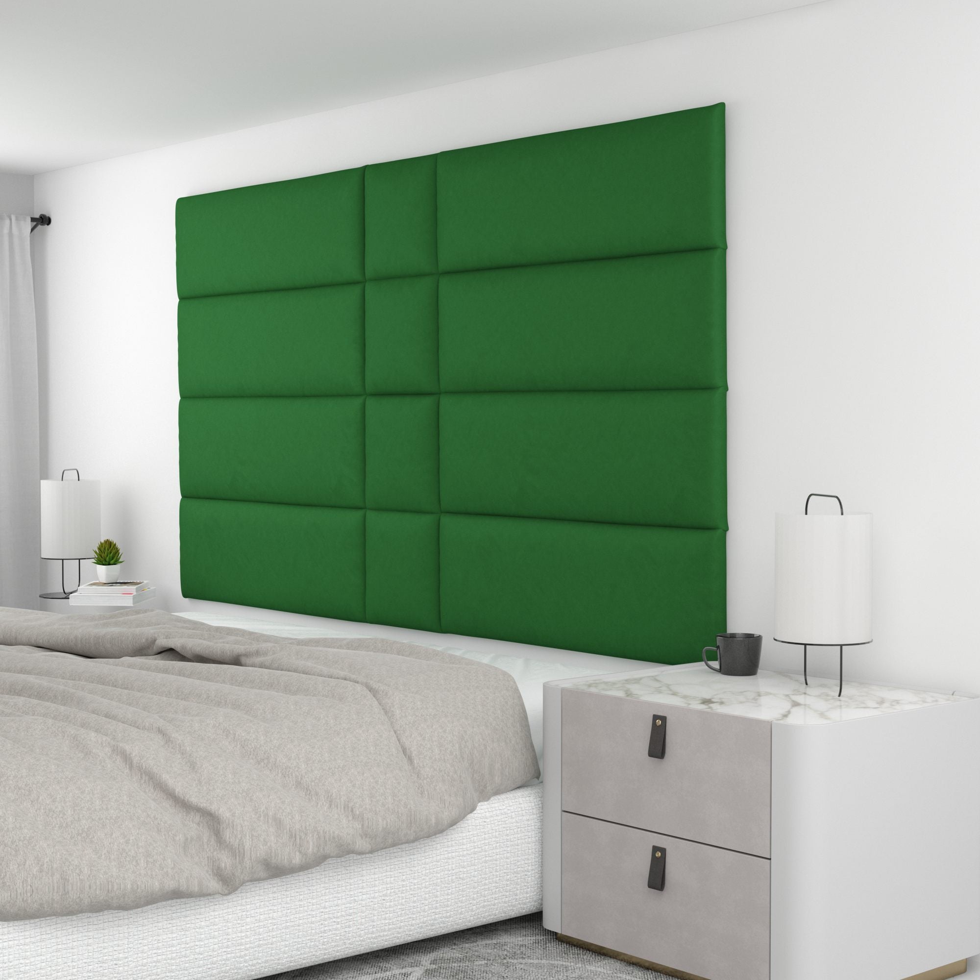 Finish your bedroom, office, or living space in elegance with Wall Panel Pros! Our wall panels mount easily in just minutes and completely transform your room without breaking the bank. Our panels are offered in three sizes (12x12", 12x24", and 12x36") in over 40 color/texture options, making the pattern possibilities endless. With such a wide variety of looks, you are sure to find or create something that compliments your decor seamlessly. Mounting the panels is easy: just measure to find the center point of your install area, mark the location of where your first set of screws will go with the included locator pins (these pop into the mounting pucks on the backs of the panels) and a level, and screw the included mounting pucks into the wall where your marks have been made for a perfectly aligned array! The first panel is used as a reference to help mark the locations of each next panel; the process couldn't be more simple. Once mounted, the panels can be easily removed for cleaning. Wall Panel Pros kits are perfect as a luxurious headboard replacement, to back a couch in a living area, or even to serve as an ultra-professional backdrop for your office desk. Upgrade the look of your home or office in no time with Wall Panel Pros!
